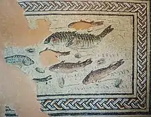 La seconde maison (maison II ou maison nord), dont l'alignement ne respecte pas celui de la rue, a livré des mosaïques plus tardives datant de la fin du IIe ou du début du IIIe siècle (époque des Sévères). Sur l'une d'entre elles, découverte en 1967, qui couvrait un seuil de porte[21] ou le sol de la salle à manger (triclinium), figurent des poissons d'eau douce (perches, truites, peut-être une tanche ou une carpe) et des coquillages, une variété de moules (anodontes) de rivière.