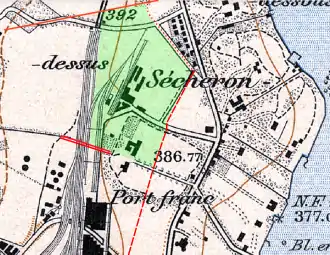 Sur l’Atlas topographique de la Suisse (plan Siegfried, 1898-1915), il n’y a que quelques bâtiments à « Sécheron ». L'avenue Blanc et le chemin des Mines délimitent déjà le site à l'est. L’avenue de Sécheron donne accès au site. Au nord, la route sera déplacée lors de la création de l’avenue de la Paix. Au sud, un chemin existe là où sera construite l'avenue de France, le pont est absent. La zone industrielle se développera dans ces limites.