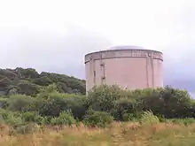 - l'autre à la base de la cheminée servant à la filtration et au rejet de l'air, du CO2 provenant de la dépressurisation de salles entourant le réacteur ; dépressurisation du centre vers la périphérie (sans effet : béton écorché à la base de la cheminée).