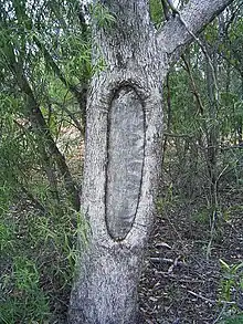 Des arbres gâchés, résultés de l’enlèvement de l’écorce pour la fabrication des boucliers, des vaisseaux, des abris et des autres outils, se trouvent dans des lieux où survivent certaines espèces d’arbres d’un âge approprié.