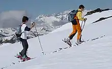 Le ski est un moyen de locomotion[1],[2] individuel qui s'utilise par paire comprenant deux patins[2] longs et étroits appelés skis, fixés aux pieds, et un ensemble de disciplines sportives essentiellement hivernales et basées sur le principe de la glisse. Vulgarisée grâce au ski sur neige[2], introduite dans les Alpes et les autres massifs européens à la fin du XIXe siècle, cette pratique est évidemment dépendante de la présence, de la résistance et de l'épaisseur du manteau neigeux, ce qui limite l'activité aux régions montagneuses ou nordiques, ainsi qu'à la saison hivernale, plus rarement en été, dans les stations d'altitude.