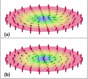 Récemment, on appelle aussi skyrmion magnétique une structure de spin similaire à un vortex ou tourbillon de spin.