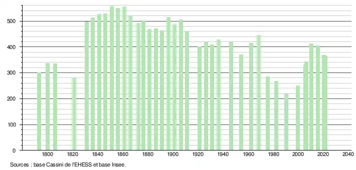 L'évolution du nombre d'habitants est connue à travers les recensements de la population effectués dans la commune depuis 1793. Pour les communes de moins de 10 000 habitants, une enquête de recensement portant sur toute la population est réalisée tous les cinq ans, les populations légales des années intermédiaires étant quant à elles estimées par interpolation ou extrapolation[27]. Pour la commune, le premier recensement exhaustif entrant dans le cadre du nouveau dispositif a été réalisé en 2005[28].