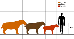 Taille des trois espèces du genre Smilodon comparé à l'actuel Homo sapiens.