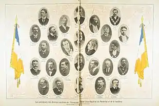 Les présidents des diverses sections de l'Association Saint-Jean-Baptiste de Montréal et de la banlieue. Image tirée de L'album universel, vol. 20 n° 61. pp. 186-187 (24 juin 1903)