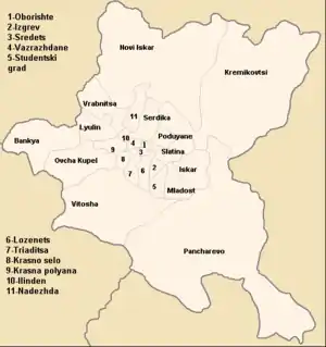 Stolitchna obchtina (Municipalité de la capitale) est administré par maire de municipalité et chaque raion - par maire de raion (кмет на район).