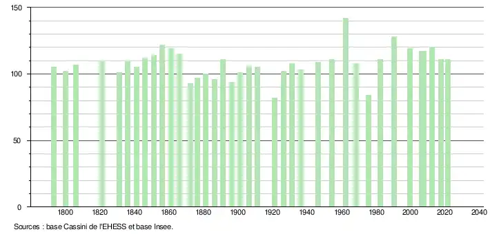 L'évolution du nombre d'habitants est connue à travers les recensements de la population effectués dans la commune depuis 1793. Pour les communes de moins de 10 000 habitants, une enquête de recensement portant sur toute la population est réalisée tous les cinq ans, les populations légales des années intermédiaires étant quant à elles estimées par interpolation ou extrapolation[19]. Pour la commune, le premier recensement exhaustif entrant dans le cadre du nouveau dispositif a été réalisé en 2007[20].