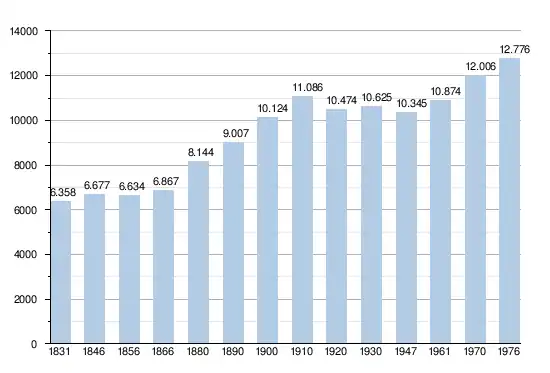 Les chiffres des années 1831 à 1970 tiennent compte des chiffres des anciennes communes fusionnées.