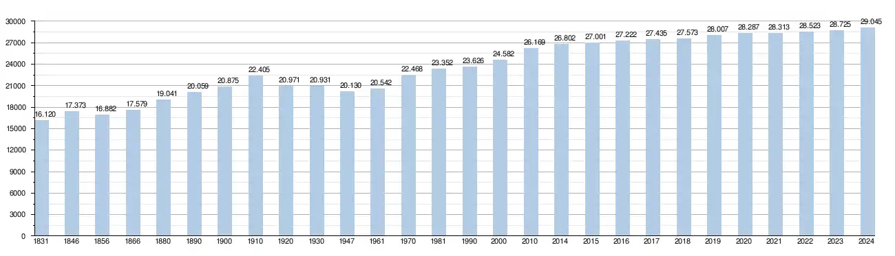 Elle comptait, au , 29 099 habitants (14 146 hommes et 14 953 femmes) [20], soit une densité de 261,52 habitants/km² pour une superficie de 111,27 km²[21].