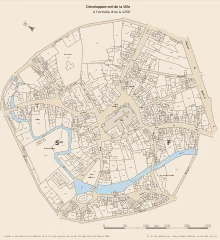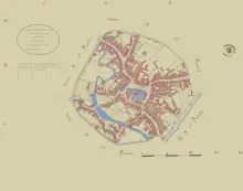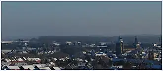 Hormis la ville de Soignies, la commune est constituée depuis la fusion des communes du , des villages de Casteau au sud, Chaussée-Notre-Dame-Louvignies, Horrues, Neufvilles à l'ouest, Naast et Thieusies au sud-est. L'altitude de la commune varie entre plus ou moins 70 et 140 mètres (100 à 110 mètres pour le centre-ville)[15]. Malgré l'évolution urbanistique, la ville a gardé sa structure médiévale. En effet, on perçoit encore aisément sur une vue aérienne la structure circulaire qu'occupaient les remparts ainsi que, intra-muros, les axes courbes formés par les principaux accès qui, au départ des portes, convergent vers la collégiale.