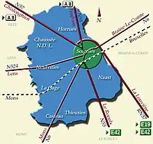Situation de la commune dans l'arrondissement de Soignies et dans la province de Hainaut | |||||