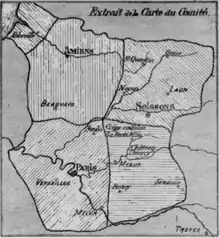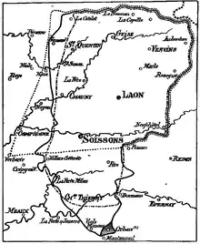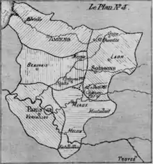 Formant des divisions très inégales pour certains départements, ce projet est vivement critiqué. Pourtant, dans la carte ci-contre représentant la proposition du Comité de Constitution en septembre 1789, la région naturelle du Soissonnais ne se trouve pas amputée de sa partie occidentale même si à contrario, elle en perd sa partie méridionale située au nord de l'Automne[56] séparant ainsi des communes comme Villers-Cotterêts et La Ferté-Milon en dehors du Soissonnais. Si nous admettons volontiers aujourd'hui que les limites historiques du pays du Soissonnais, de la généralité de Soissons et du diocèse de Soissons semblent mieux respectées dans cette version que dans le projet final qui fut adopté en 1790, la raison principale pour laquelle le projet du futur département du Soissonnais est rejeté est d'une toute autre nature. Du fait de leur situation et de leur importance, de nombreuses villes prétendent au rôle de préfecture de la nouvelle circonscription. Ainsi en est-il de Soissons et de Laon entre lesquelles commence une lutte sans merci.