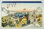 - L'une des ombrelles qui figurent sur la toute première estampe, Nihonbashi, porte l'inscription « année du mouton », ce qui permet de dater le début de la série de 1835.