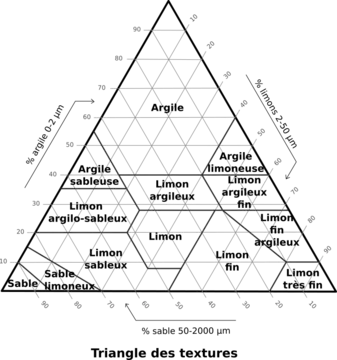 La composition idéale d'un sol agricole comporte en volume[29] : 25 % d'air, 25 % d'eau, et 50 % de solides (45 % d'éléments minéraux  argile, limon, sable , et 5 % de matière organique)[30].