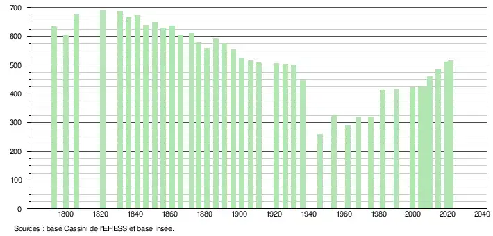 L'évolution du nombre d'habitants est connue à travers les recensements de la population effectués dans la commune depuis 1793. Pour les communes de moins de 10 000 habitants, une enquête de recensement portant sur toute la population est réalisée tous les cinq ans, les populations légales des années intermédiaires étant quant à elles estimées par interpolation ou extrapolation[20]. Pour la commune, le premier recensement exhaustif entrant dans le cadre du nouveau dispositif a été réalisé en 2004[21].