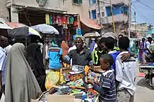 L'économie de la Somalie est surtout agricole, mais est aussi basée sur l'exploitation du sel. Plusieurs compagnies internationales, comme BP ou ExxonMobil, montrent un intérêt croissant pour le pétrole somalien[36] : en effet, le nombre de barils en Somalie est estimé entre 8 et 15 milliards[37]. L'économie est assistée par l'aide internationale et les rentrées de devises de la diaspora, évaluées à plus de 60 % du PIB en 2007[38].