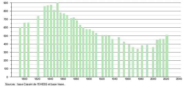 L'évolution du nombre d'habitants est connue à travers les recensements de la population effectués dans la commune depuis 1793. Pour les communes de moins de 10 000 habitants, une enquête de recensement portant sur toute la population est réalisée tous les cinq ans, les populations légales des années intermédiaires étant quant à elles estimées par interpolation ou extrapolation[22]. Pour la commune, le premier recensement exhaustif entrant dans le cadre du nouveau dispositif a été réalisé en 2005[23].