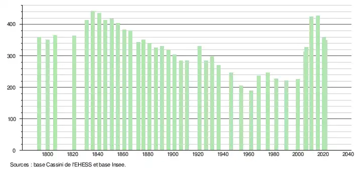 L'évolution du nombre d'habitants est connue à travers les recensements de la population effectués dans la commune depuis 1793. Pour les communes de moins de 10 000 habitants, une enquête de recensement portant sur toute la population est réalisée tous les cinq ans, les populations légales des années intermédiaires étant quant à elles estimées par interpolation ou extrapolation[22]. Pour la commune, le premier recensement exhaustif entrant dans le cadre du nouveau dispositif a été réalisé en 2005[23].