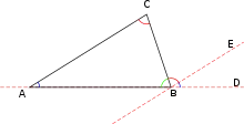 Les angles ACB, CBE sont égaux comme alternes-internes par rapport aux parallèles AC, BE et à la sécante BC ; les angles CAB, EBD sont aussi égaux comme correspondants par rapport aux mêmes parallèles et à la sécante AB. Donc, la somme des trois angles ABC, ACB, CAB du triangle est égale à la somme des trois angles adjacents ABC, CBE, EBD formés sur la ligne droite AD, c'est-à-dire qu'elle est égale à deux angles droits.