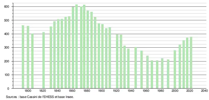 L'évolution du nombre d'habitants est connue à travers les recensements de la population effectués dans la commune depuis 1793. Pour les communes de moins de 10 000 habitants, une enquête de recensement portant sur toute la population est réalisée tous les cinq ans, les populations légales des années intermédiaires étant quant à elles estimées par interpolation ou extrapolation[19]. Pour la commune, le premier recensement exhaustif entrant dans le cadre du nouveau dispositif a été réalisé en 2006[20].