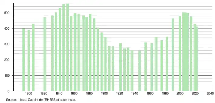 L'évolution du nombre d'habitants est connue à travers les recensements de la population effectués dans la commune depuis 1793. Pour les communes de moins de 10 000 habitants, une enquête de recensement portant sur toute la population est réalisée tous les cinq ans, les populations légales des années intermédiaires étant quant à elles estimées par interpolation ou extrapolation[16]. Pour la commune, le premier recensement exhaustif entrant dans le cadre du nouveau dispositif a été réalisé en 2004[17].
