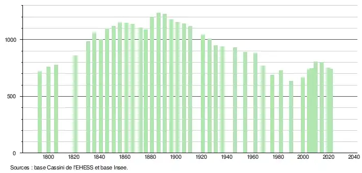 L'évolution du nombre d'habitants est connue à travers les recensements de la population effectués dans la commune depuis 1793. Pour les communes de moins de 10 000 habitants, une enquête de recensement portant sur toute la population est réalisée tous les cinq ans, les populations légales des années intermédiaires étant quant à elles estimées par interpolation ou extrapolation[27]. Pour la commune, le premier recensement exhaustif entrant dans le cadre du nouveau dispositif a été réalisé en 2004[28].