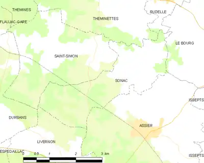 La commune de Sonac s'étend au nord-est sur les terrains les plus anciens du Limargue et au sud-ouest sur les calcaires du causse[3].