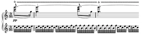 pris à la triple croche[N 7]). Les valeurs de la cellule rythmique de base sont à nouveau deux fois plus rapides que précédemment : la « double croche/triple croche en triolet » devenant « triple croche/quadruple croche en triolet ».