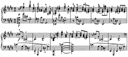 | 3 | ![]() Mm. 227-230. Le passage dérive du thème presto tumultuoso esaltato. ![]() Mm. 247-248 and 251-252. Le thème formé de trilles et le thème languido sont parodiés. |