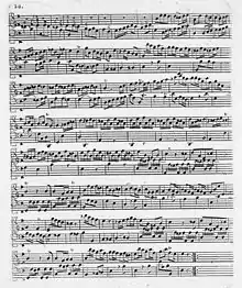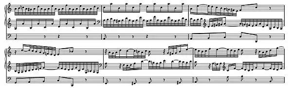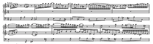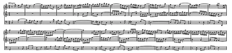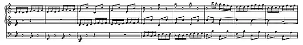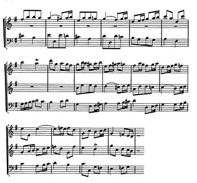 L'un des principaux compositeurs à avoir développé la sonate en trio purement instrumentale fut le contemporain de Bach, Georg Philipp Telemann, parrain de Carl Philipp Emanuel Bach et son prédécesseur au poste de maître de chapelle à Hambourg. L'une des seules caractéristiques que Telemann a adoptées de la tradition française plus ancienne de la sonate en trio est l'adaptabilité de l'instrumentation. Les Six Concertos et Six Suites (1715-1720) de Telemann pouvaient être joués par deux ou trois instruments (avec, en option, une viole de gambe ou un violoncelle). Certains mouvements des Concertos présentent parfois des similitudes de texture et de forme avec les sonates pour orgue de Bach : Williams[14] donne l'exemple suivant, tiré de la seconde moitié du deuxième mouvement du Concert IV pour flûte et clavecin en mi mineur, TWV. 42:e3. :