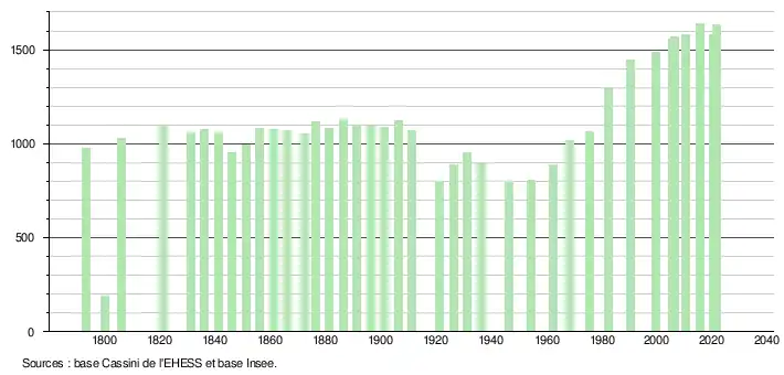 L'évolution du nombre d'habitants est connue à travers les recensements de la population effectués dans la commune depuis 1793. Pour les communes de moins de 10 000 habitants, une enquête de recensement portant sur toute la population est réalisée tous les cinq ans, les populations légales des années intermédiaires étant quant à elles estimées par interpolation ou extrapolation[23]. Pour la commune, le premier recensement exhaustif entrant dans le cadre du nouveau dispositif a été réalisé en 2005[24].