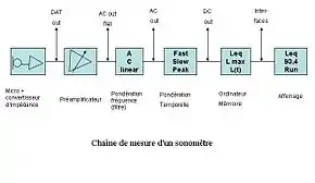 Le sonomètre convertit la pression acoustique en signal électrique, le filtre selon une courbe normalisée, en produit la valeur efficace qu'elle intègre sur une durée choisie.
