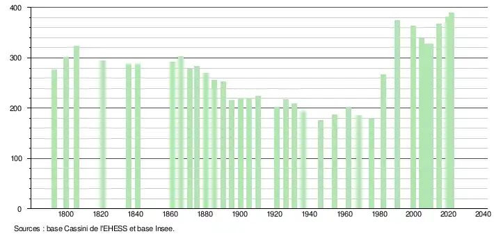 L'évolution du nombre d'habitants est connue à travers les recensements de la population effectués dans la commune depuis 1793. Pour les communes de moins de 10 000 habitants, une enquête de recensement portant sur toute la population est réalisée tous les cinq ans, les populations légales des années intermédiaires étant quant à elles estimées par interpolation ou extrapolation[16]. Pour la commune, le premier recensement exhaustif entrant dans le cadre du nouveau dispositif a été réalisé en 2004[17].