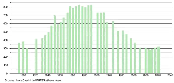 L'évolution du nombre d'habitants est connue à travers les recensements de la population effectués dans la commune depuis 1793. Pour les communes de moins de 10 000 habitants, une enquête de recensement portant sur toute la population est réalisée tous les cinq ans, les populations légales des années intermédiaires étant quant à elles estimées par interpolation ou extrapolation[18]. Pour la commune, le premier recensement exhaustif entrant dans le cadre du nouveau dispositif a été réalisé en 2004[19].
