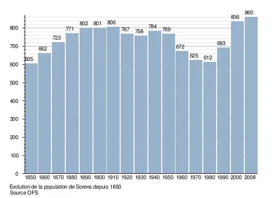Le graphique suivant résume l'évolution de la population de Sorens entre 1850 et 2008[4] :