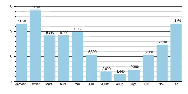 Les crues peuvent être très importantes. Les QIX 2 et QIX 5 valent respectivement 130 et 200 m3/s. Le QIX 10 est de 250 m3/s, le QIX 20 de 300 m3/s, tandis que le QIX 50 n'a pas été calculé, faute de durée d'observation suffisante.
