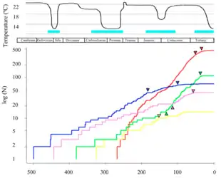 - l'étendue des estrans[35], lorsque sur les plateaux continentaux se développent, lors des périodes chaudes au niveau général des mers élevé, des formations végétales de type « mangrove » (mais constituées d'espèces à spores), favorisant les espèces animales possédant des appendices ou des nageoires solides et des cavités ou tubes respiratoires ou encore des vessies natatoires richement vascularisées et plissées, à même d'extraire l'oxygène de l'air O2 en période de marée basse[36].