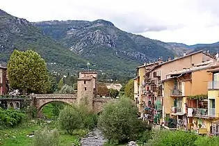 Vue sur Sospel. La Bévéra sous le Pont Vieux. | |||||