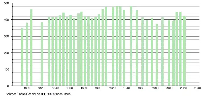 L'évolution du nombre d'habitants est connue à travers les recensements de la population effectués dans la commune depuis 1793. Pour les communes de moins de 10 000 habitants, une enquête de recensement portant sur toute la population est réalisée tous les cinq ans, les populations légales des années intermédiaires étant quant à elles estimées par interpolation ou extrapolation[32]. Pour la commune, le premier recensement exhaustif entrant dans le cadre du nouveau dispositif a été réalisé en 2005[33].