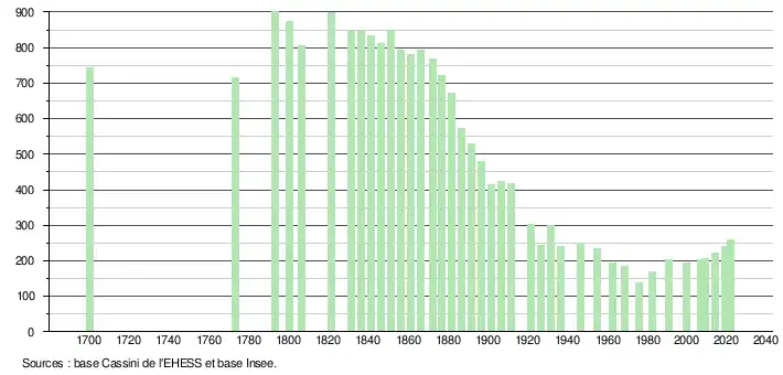 L'évolution du nombre d'habitants est connue à travers les recensements de la population effectués dans la commune depuis 1700. Pour les communes de moins de 10 000 habitants, une enquête de recensement portant sur toute la population est réalisée tous les cinq ans, les populations légales des années intermédiaires étant quant à elles estimées par interpolation ou extrapolation[25]. Pour la commune, le premier recensement exhaustif entrant dans le cadre du nouveau dispositif a été réalisé en 2008[26].