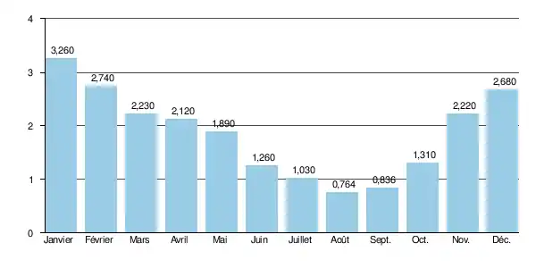 Le débit instantané maximal enregistré durant cette période a été de 35,7 m3/s le , soit une hauteur de 1,67 mètre. La valeur journalière maximale a été enregistrée le avec 26,3 m3/s.