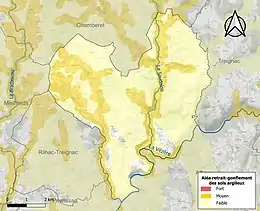Le retrait-gonflement des sols argileux est susceptible d'engendrer des dommages importants aux bâtiments en cas d’alternance de périodes de sécheresse et de pluie. 31,9 % de la superficie communale est en aléa moyen ou fort (26,8 % au niveau départemental et 48,5 % au niveau national). Sur les 149 bâtiments dénombrés sur la commune en 2019, 39 sont en aléa moyen ou fort, soit 26 %, à comparer aux 36 % au niveau départemental et 54 % au niveau national. Une cartographie de l'exposition du territoire national au retrait gonflement des sols argileux est disponible sur le site du BRGM[16],[Carte 2].