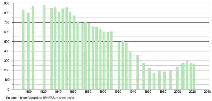 L'évolution du nombre d'habitants est connue à travers les recensements de la population effectués dans la commune depuis 1793. Pour les communes de moins de 10 000 habitants, une enquête de recensement portant sur toute la population est réalisée tous les cinq ans, les populations légales des années intermédiaires étant quant à elles estimées par interpolation ou extrapolation[29]. Pour la commune, le premier recensement exhaustif entrant dans le cadre du nouveau dispositif a été réalisé en 2007[30].