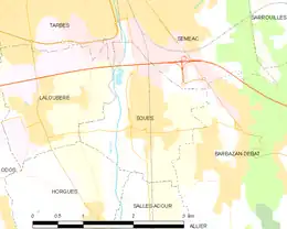 Les communes les plus proches[Note 1] sont[3] : Barbazan-Debat (2,0 km), Horgues (2,1 km), Laloubère (2,1 km), Salles-Adour (2,4 km), Séméac (2,6 km), Momères (3,1 km), Odos (3,5 km), Allier (3,7 km).
