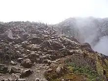 Vue du sommet de la Soufrière constitué d'un dôme de lave hérissé d'aiguilles. | |||