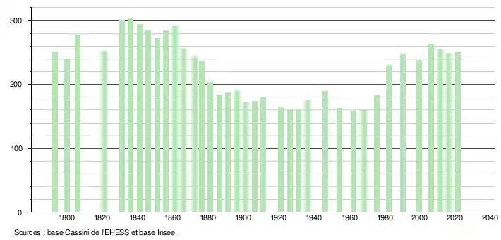 L'évolution du nombre d'habitants est connue à travers les recensements de la population effectués dans la commune depuis 1793. Pour les communes de moins de 10 000 habitants, une enquête de recensement portant sur toute la population est réalisée tous les cinq ans, les populations légales des années intermédiaires étant quant à elles estimées par interpolation ou extrapolation[24]. Pour la commune, le premier recensement exhaustif entrant dans le cadre du nouveau dispositif a été réalisé en 2006[25].