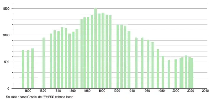 L'évolution du nombre d'habitants est connue à travers les recensements de la population effectués dans la commune depuis 1793. Pour les communes de moins de 10 000 habitants, une enquête de recensement portant sur toute la population est réalisée tous les cinq ans, les populations légales des années intermédiaires étant quant à elles estimées par interpolation ou extrapolation[21]. Pour la commune, le premier recensement exhaustif entrant dans le cadre du nouveau dispositif a été réalisé en 2008[22].