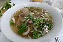 - Phở – nouilles de riz blanches dans un bouillon de bœuf avec de fines tranches de bœuf, garnies d'ingrédients comme le ciboule, oignons, feuilles de coriandre, ngo gai ("herbe de feuilles à dent"), et menthe[7]. Le basilic, citron ou citron vert, pousses de soja, et piments sont typiquement servis à part sur une assiette, ce qui permet aux clients d'ajuster le goût selon leurs préférences. La sauce hoisin et sauce aux anchois sont parfois ajoutées. Le bánh đa au nord du pays ressemble au phở.