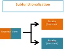 La sous-fonctionnalisation (ou subfonctionnalisation) est un mécanisme, proposé par Stoltzfus en 1999[1] ainsi que Force et ses collaborateurs la même année[2], constituant l'une des issues possibles de la divergence fonctionnelle ayant lieu à la suite d'un événement de duplication génique, pendant lequel une paire de gènes provenant d'une duplication (paralogues), prennent en charge des fonctions distinctes[3],[4]. La sous-fonctionnalisation est un processus mutationnel neutre, ce qui signifie qu'aucune adaptation nouvelle n'est formée[5],[4]. Lors du processus de duplication génique, les paralogues subissent simplement une "division du travail" en conservant différentes parties (sous-fonctions) de la fonction ancestrale originelle[6]. Cet événement de séparation a lieu en raison de l'extinction génique segmentaire conduisant à la formation de paralogues qui ne sont plus des duplicons, car chaque gène conserve seulement une fonction[4]. Il est important de noter que le gène ancestral est à la base capable de prendre en charge les deux fonctions, et les gènes dupliqués descendants ne peuvent désormais prendre en charge qu'une des fonctions ancestrales originelles[4].