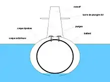 - des ballasts situés entre les deux coques et dont le remplissage ou la vidange permet la prise de plongée (ouverture des purges pour faire pénétrer l'eau dans le ballast) et le retour en surface (en chassant de l'air comprimé pour les vider). Pour les sous-marins modernes, les ballasts sont situés à l'avant et à l'arrière ;